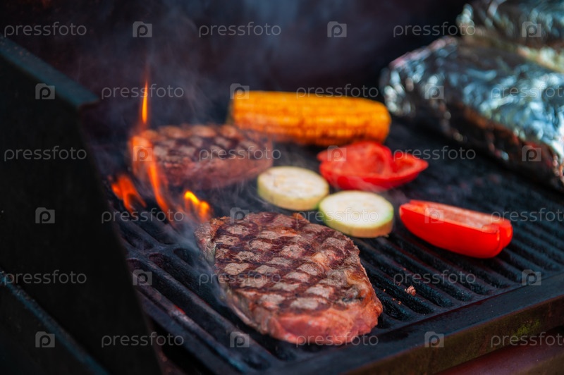 Говяжьи стейки с овощами на гриле с открытым пламенем