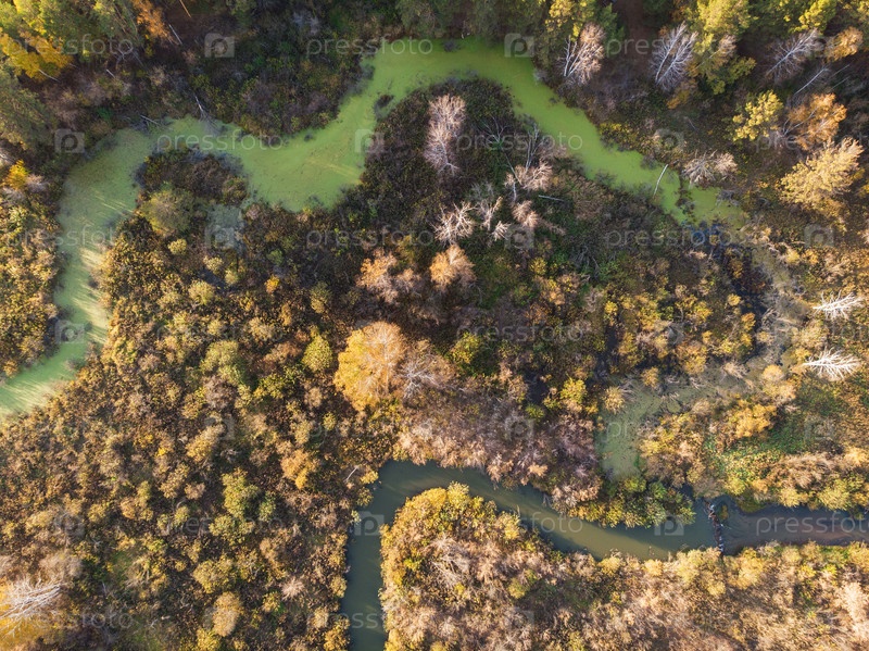 Вид с воздуха с беспилотника на осенний пейзаж с рекой
