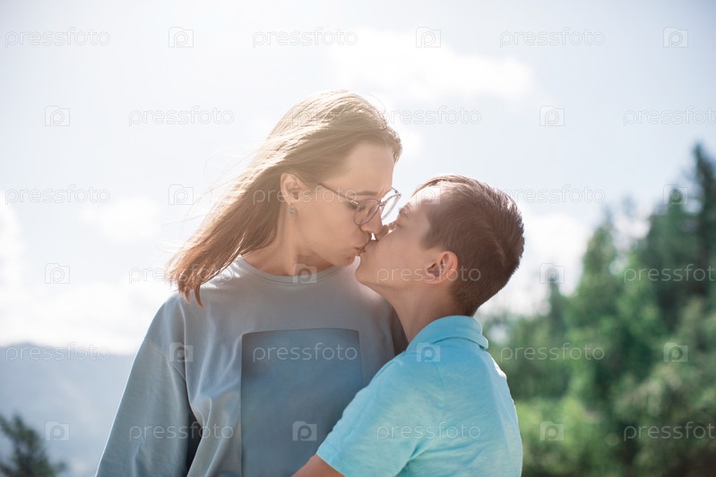 Ребенок обнимает маму в горной поездке. Внутренний туризм, путешествия, отдых и свобода. Горный Алтай, красота летнего вечернего пейзажа