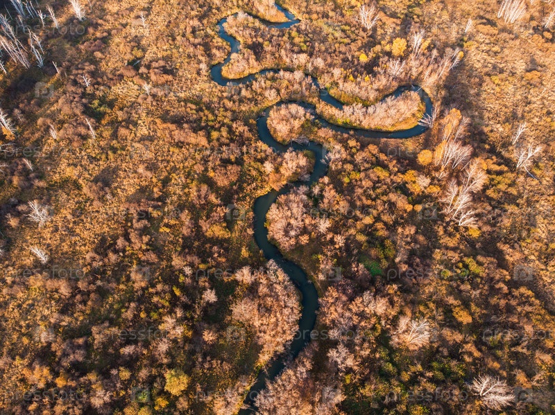 Вид с воздуха с беспилотника на осенний пейзаж с рекой