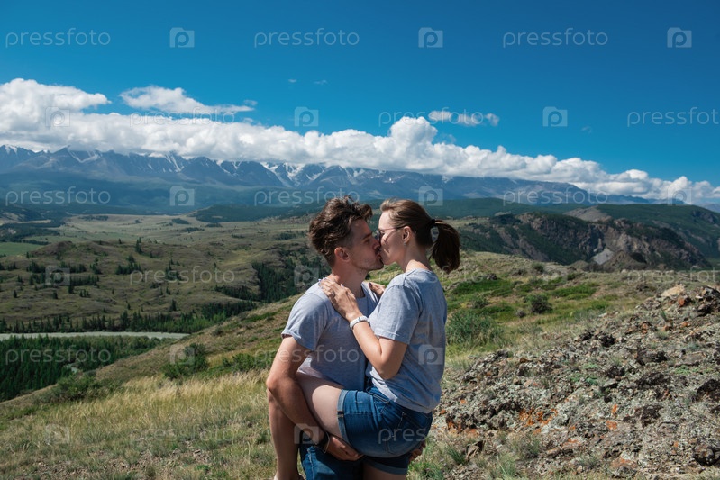 Влюбленная пара вместе на Алтайских горах, любуясь видом