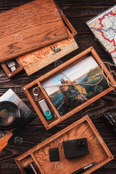 Деревянная фотокоробка с фото из путешествия. Украшена разными вещами. Концепция путешествия