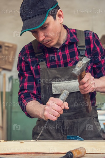 Плотник, работающий с долотом и молотком в деревянной мастерской. Профессия, плотничество и концепция ручной работы по дереву