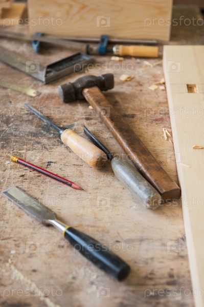 Инструменты для работы по дереву на деревянной доске