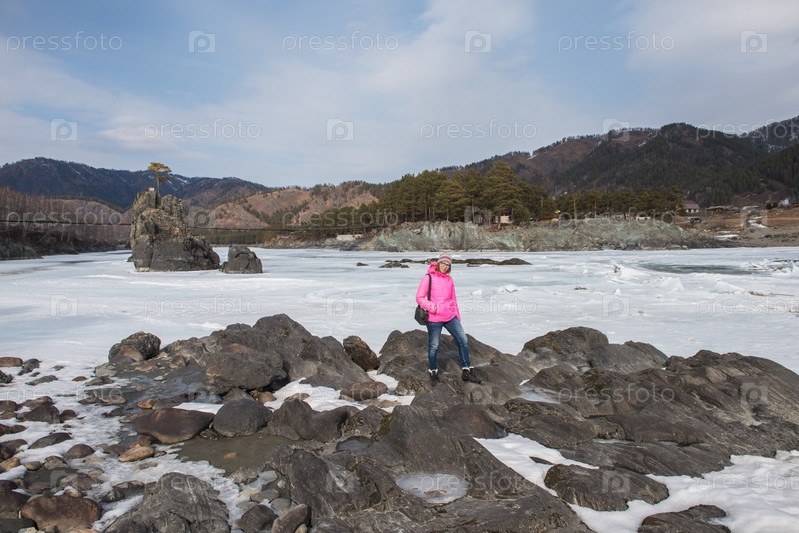 Счастливая женщина отдыхает на берегу реки в солнечный зимний день красоты, в горах Алтая. Концепция отпуска путешествия
