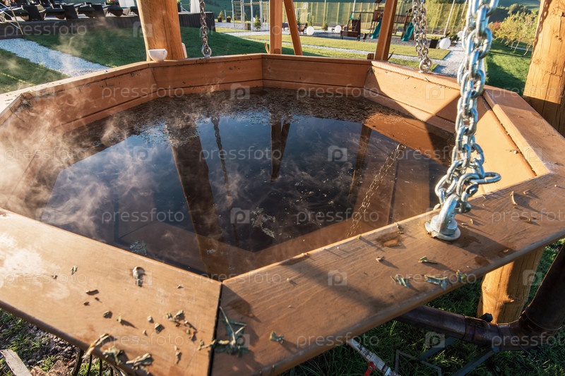 Большой чан с горячей водой и травами для купания, спа и отдыха. На открытом воздухе в горах Алтая, Сибирь, Россия