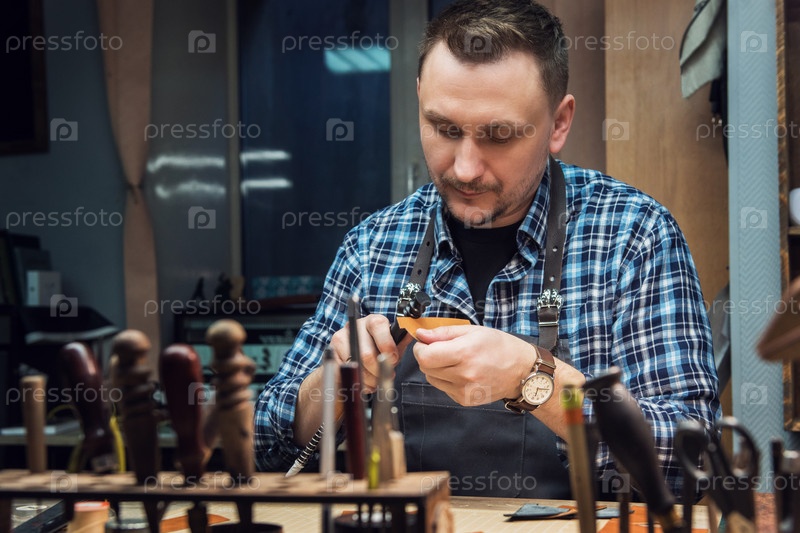 Мужчина работает с кожаным текстилем в мастерской. Концепция ручного ремесленного производства кожаных изделий