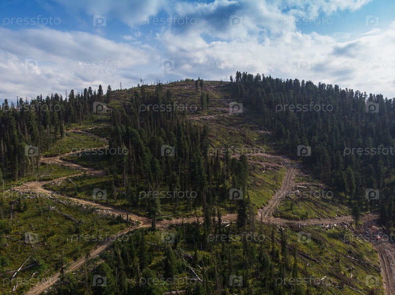 Вид на вырубленный лес в день красоты в горах Алтая. Аэрофотосъемка на дроне