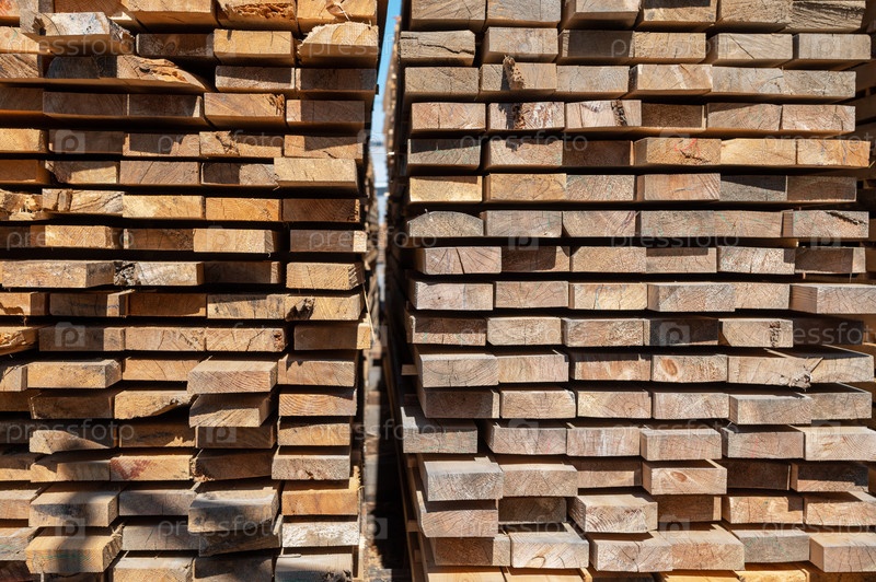 Сложенные деревянные доски крупным планом на складе пиломатериалов. Концепция деревообрабатывающей промышленности