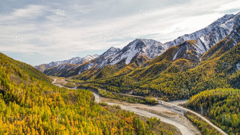 Осень в горах. Вид на горы и реку с высоты птичьего полета. Вид на горную реку и осенний лес с высоты птичьего полета. Горы, серпантин, река в солнечный день. Красивый горный пейзаж