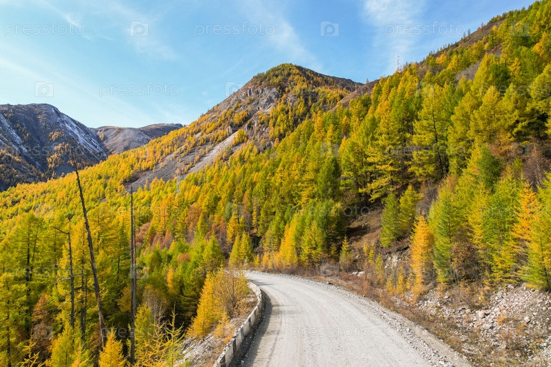 Осень в горах. Вид на горы и реку с высоты птичьего полета. Вид на горную реку и осенний лес с высоты птичьего полета. Горы, серпантин, река в солнечный день. Красивый горный пейзаж