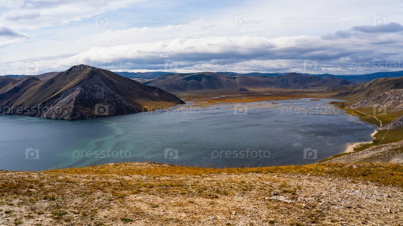 Летний пейзаж на озере. Вид на озеро Байкал. Горы, небо, озеро в ясный летний день