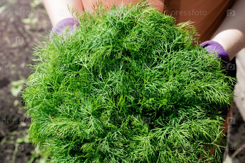 Свежий большой пучок зеленого укропа в женских руках, собранный в саду. Выращивание зелени на открытом воздухе. Урожай