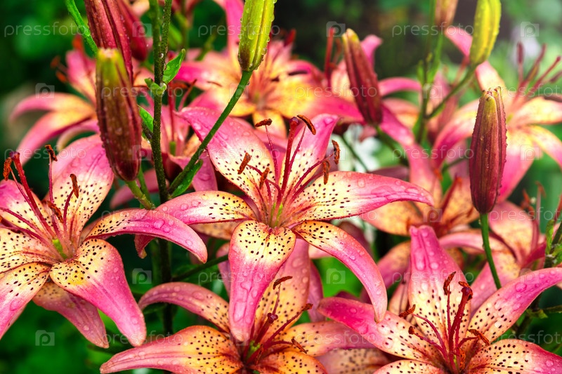 Фон цветы лилии. Азиатская лилия в саду с каплями воды на лепестках. Выращивание цветов летом