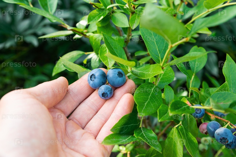 Высокий черник на кусте. От латинского слова - Vaccinium uliginosum. Фермер показывает ягоды в ладонях. Выращивание ягод в саду