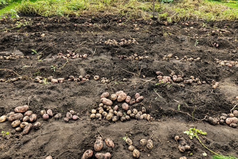 Сельскохозяйственное поле картофеля. Урожай. Выращивание овощей в саду