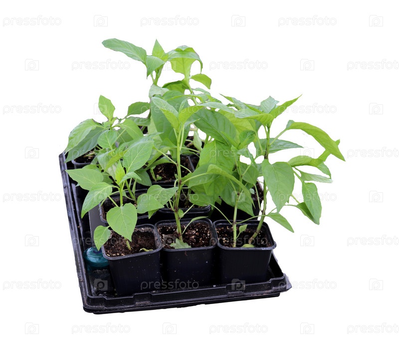 Ящик с рассадой перцев, зеленые ростки в пластиковых стаканах - изолят на белом фоне