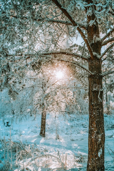 Зимний лес. Волшебная заснеженная лесная сцена с высокими деревьями, покрытыми свежим снежным покровом, создает безмятежную и чарующую атмосферу