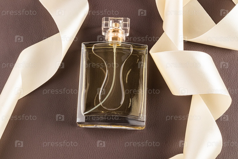 Шикарный флакон дорогих духов с кожаным ароматом на фоне коричневой кожи среди кремовой атласной ленты. вид сверху. Пустой макет флакона. шаблон
