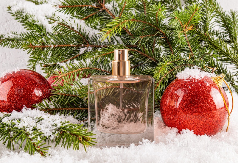 Флакон духов на фоне заснеженных веток и красных шаров стоит в снегу. Вид спереди. пустой макет флакона