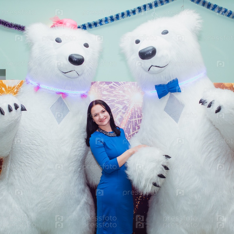 Радостное празднование с женщиной и гигантскими талисманами в виде белых медведей, одетыми в праздничные и яркие наряды
