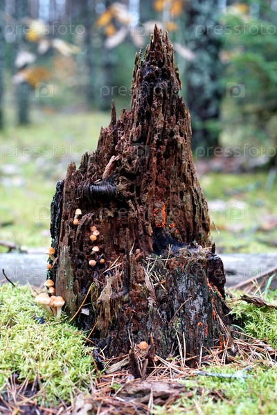 Усыпанный сосновыми иголками старый пень, поросший мхом и грибами