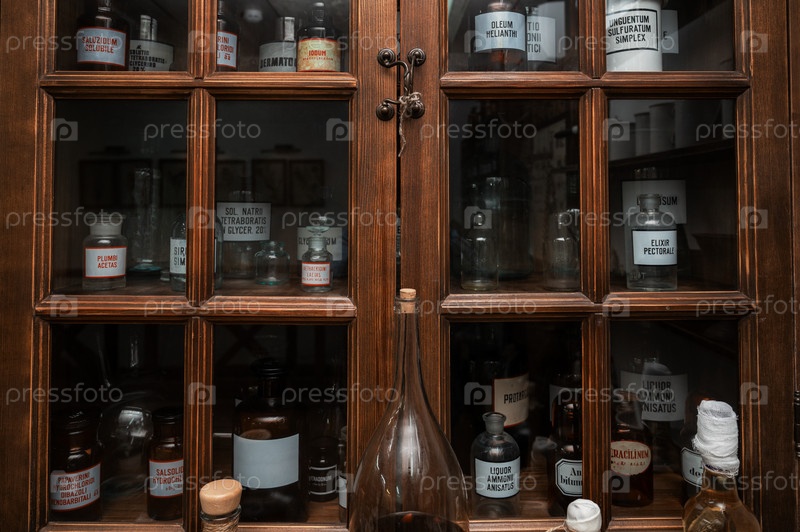 Пустые флаконы из-под духов в старой аптеке