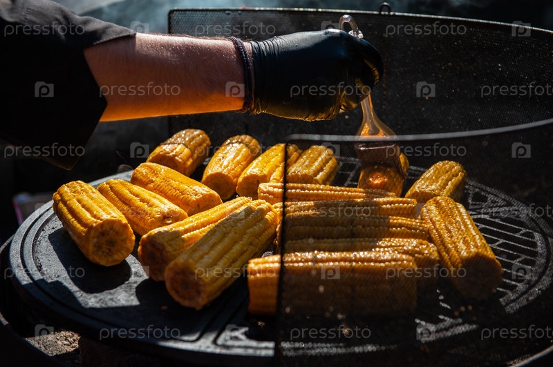 Профессиональный повар готовит кукурузу на гриле на открытом воздухе, концепция питания или кейтеринга
