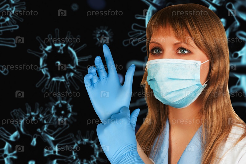 Женщина-врач в медицинской маске на трехмерном генерируемом фоне COVID-19