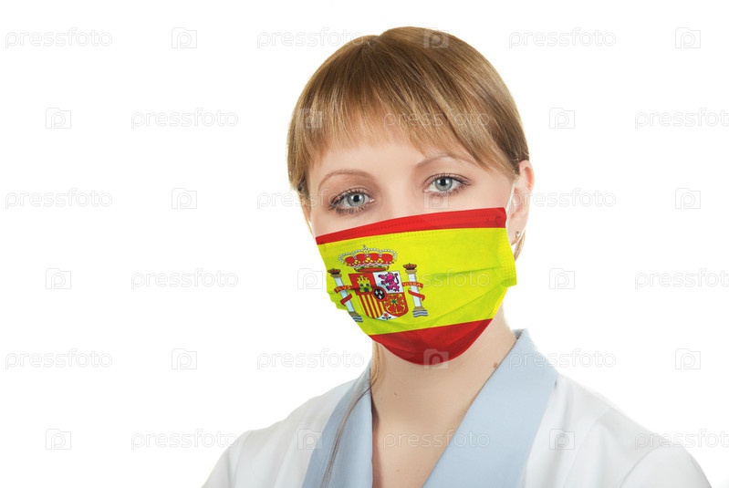 Крупный план медсестры-женщины в защитной маске с флагом Испании
