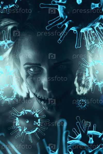 Ужасный портрет больной женщины на фоне коронавируса. Концепция заболевания коронавирусом