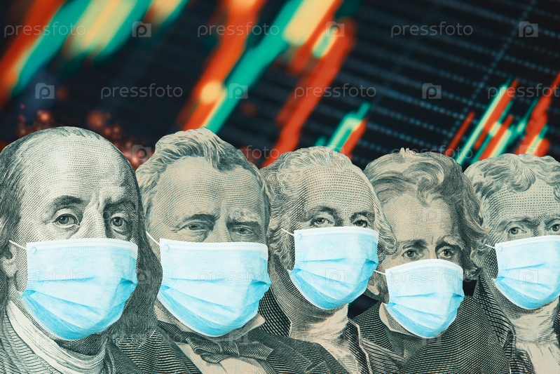 Разные американские президенты из долларовых банкнот с масками на фоне фондового рынка. Концепция мирового финансового кризиса и пандемии