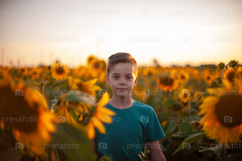 Портрет красивого светловолосого мальчика на летнем поле подсолнечников на открытом воздухе. Милый школьник веселится теплым летним вечером на закате