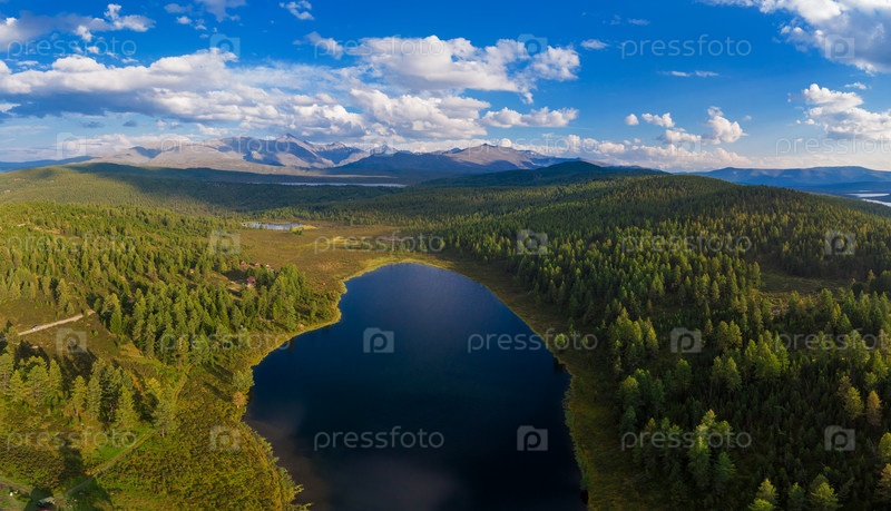 Вид с воздуха с беспилотника на озеро Киделю близ перевала Улаган, Республика Алтай, Россия