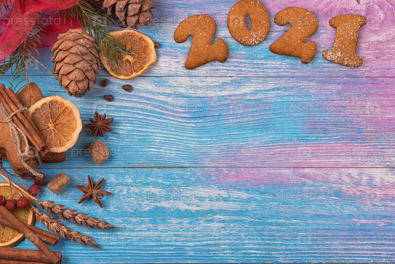 Концепция Нового года 2021: праздничные пряники на деревянном фоне, рождественская тематика