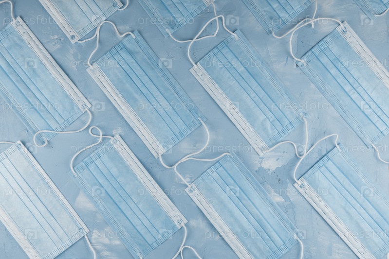 Медицинские маски на синем фоне для защиты от коронавируса. Концепция эпидемии и здравоохранения, узор, плоская планировка