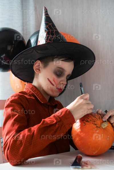 Счастливый подросток в костюме готовится к празднованию Хэллоуина, рисуя тыкву. Концепция карнавала или маскарада на Хэллоуин