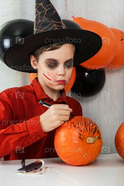 Счастливый подросток в костюме готовится к празднованию Хэллоуина, рисуя тыкву. Концепция карнавала или маскарада на Хэллоуин