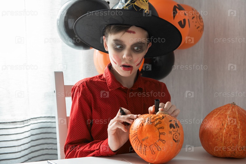 Мальчик-подросток в костюме рисует изображение коронавируса на тыкве для празднования Хэллоуина. Карнавал на Хэллоуин с новой реальностью и концепцией пандемии