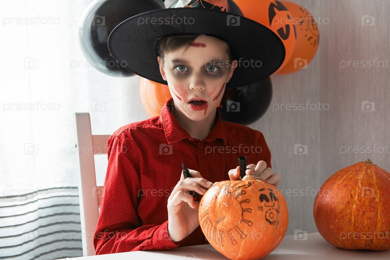 Мальчик-подросток в костюме рисует изображение коронавируса на тыкве для празднования Хэллоуина. Карнавал на Хэллоуин с новой реальностью и концепцией пандемии