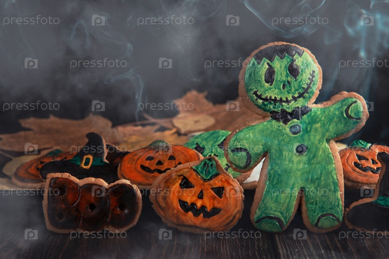 Имбирное печенье на праздник Хэллоуин на деревянном столе с местом для копирования