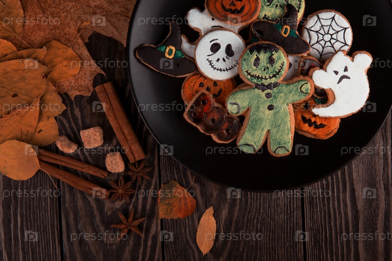 Имбирное печенье на праздник Хэллоуин на деревянном столе с местом для копирования