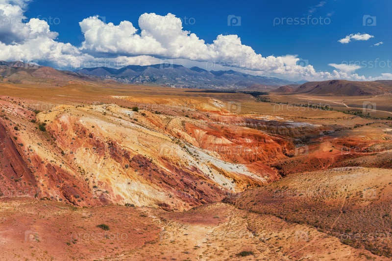 Вид с воздуха с беспилотника на текстурированные желтые и красные горы, напоминающие поверхность земли, природный ландшафт в популярном туристическом месте под названием Марс, недалеко от границы с Монголией, Чаган-Узун, Республика Алтай, Россия