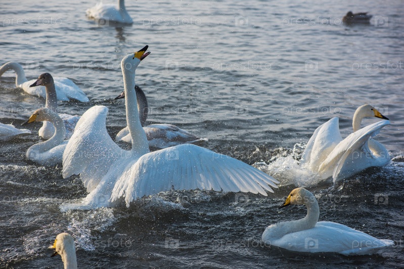 Борьба белых лебедей-кликунов в незамерзающем зимнем озере. Место зимовки лебедей, Алтай, Сибирь, Россия