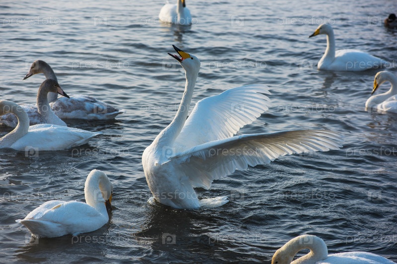 Борьба белых лебедей-кликунов в незамерзающем зимнем озере. Место зимовки лебедей, Алтай, Сибирь, Россия
