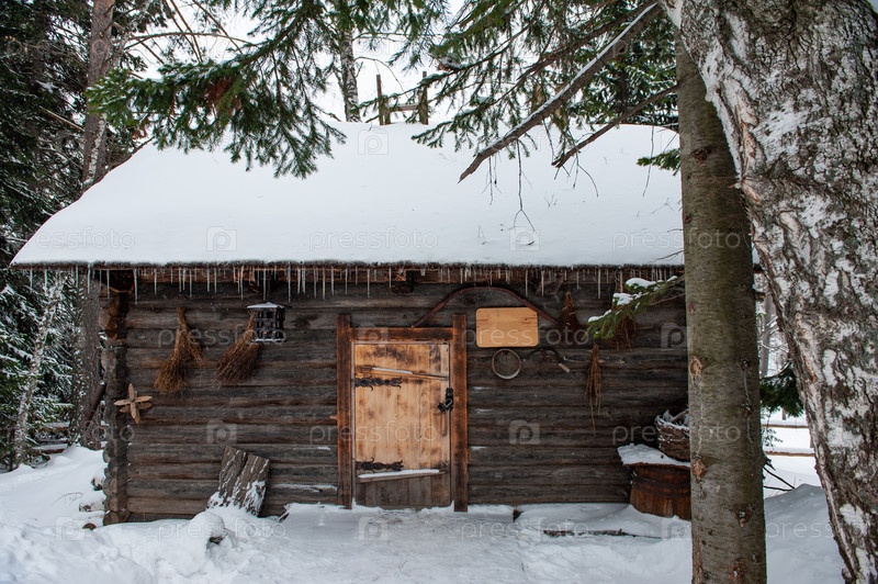 Старинный деревянный амбар в зимнем лесу. Ретро-здание начала 19 века