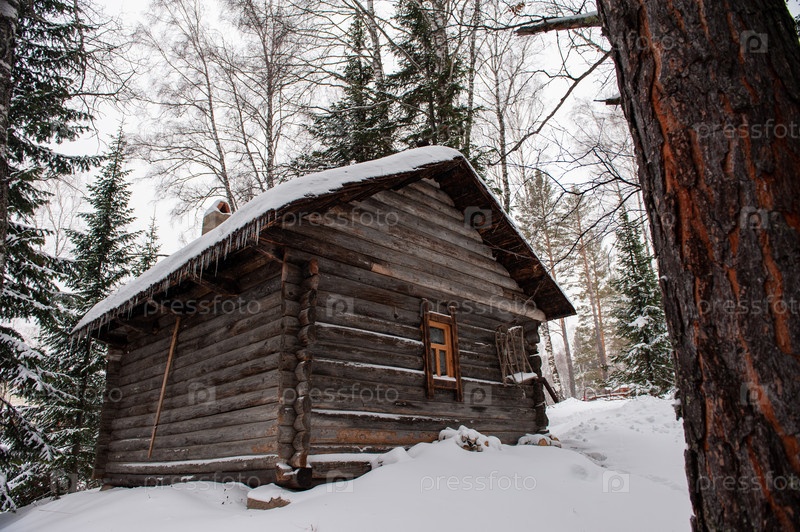 Старинный деревянный амбар в зимнем лесу. Ретро-здание начала 19 века