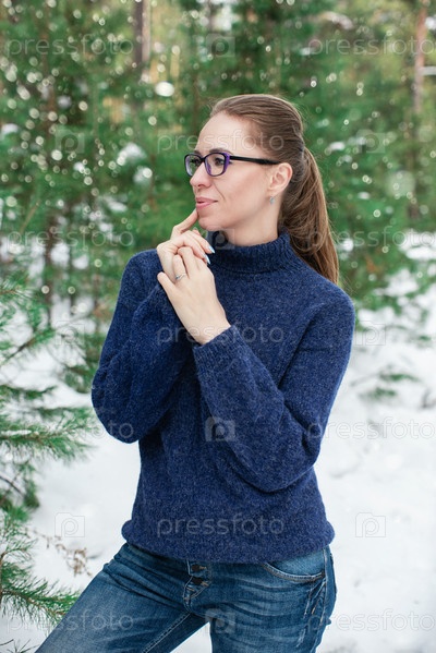 Портрет красивой женщины в шерстяном синем свитере в зимнем лесу. Концепция зимних праздников или лесная прогулка