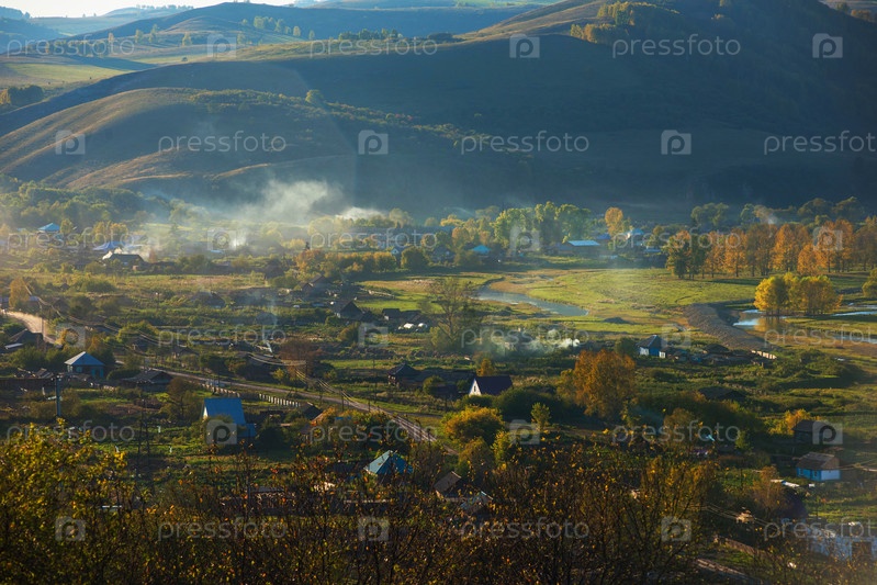 Панорама деревенского пейзажа вечером, Сибирь, Россия
