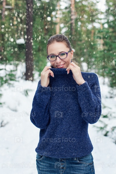Портрет красивой женщины в шерстяном синем свитере в зимнем лесу. Концепция зимних праздников или лесная прогулка